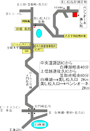 @中央本線茅野駅より、白樺湖・車山方面行きバスで50分「西白樺湖」下車 送迎10分。バスの時刻表は諏訪バス時刻表:茅野駅〜白樺湖〜車山高原〜霧ヶ峰〜上諏訪駅