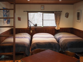 12畳の広さにベッド3つ 4人掛けテーブルにテレビ 車イスの方や高齢者におすすめ。 はしごを上ったロフトには 2名分の寝具が用意されています。 |
