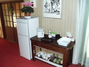 | 喫茶コーナー 2階踊り場にお茶のセットと 冷凍冷蔵庫が用意されています。 冷凍冷蔵庫内の氷とおいしい「美し松の水」は ご自由にご使用ください。 また、持ち込みされた飲食物やお土産等を 保存するのにもご利用ください。 持ち込みはOKですが、ゴミはお持ち帰りください。 |