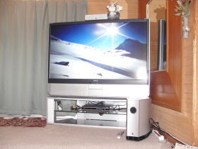 | ホールは映画館 57インチハイビジョンテレビ + 5.1chホームシアターシステム で、迫力ある映像と音をお楽しみいただけます。 20年使った50インチプロジェクターから 最近入れ替えたのでDVDソフトがやや不足気味 これからそろえて行きますが、 いらしたらぜひお楽しみください。 |